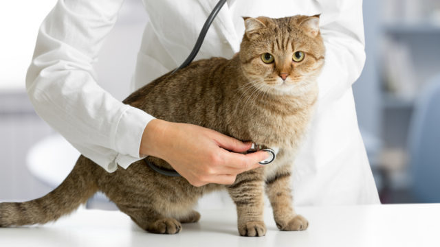 Vet examining dog and cat. Puppy and kitten at veterinarian doctor. Animal clinic. Pet check up and vaccination. Health care for dogs and cats.